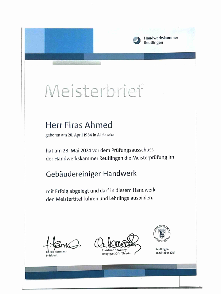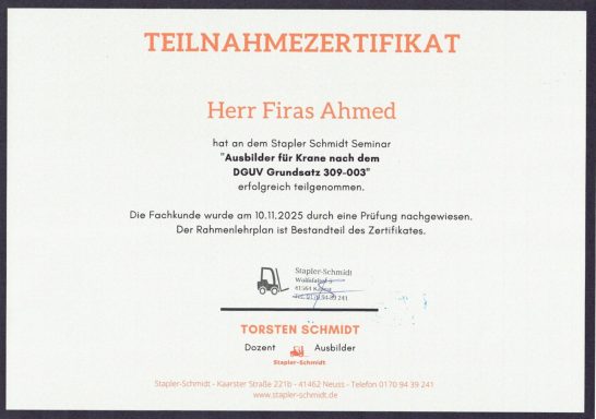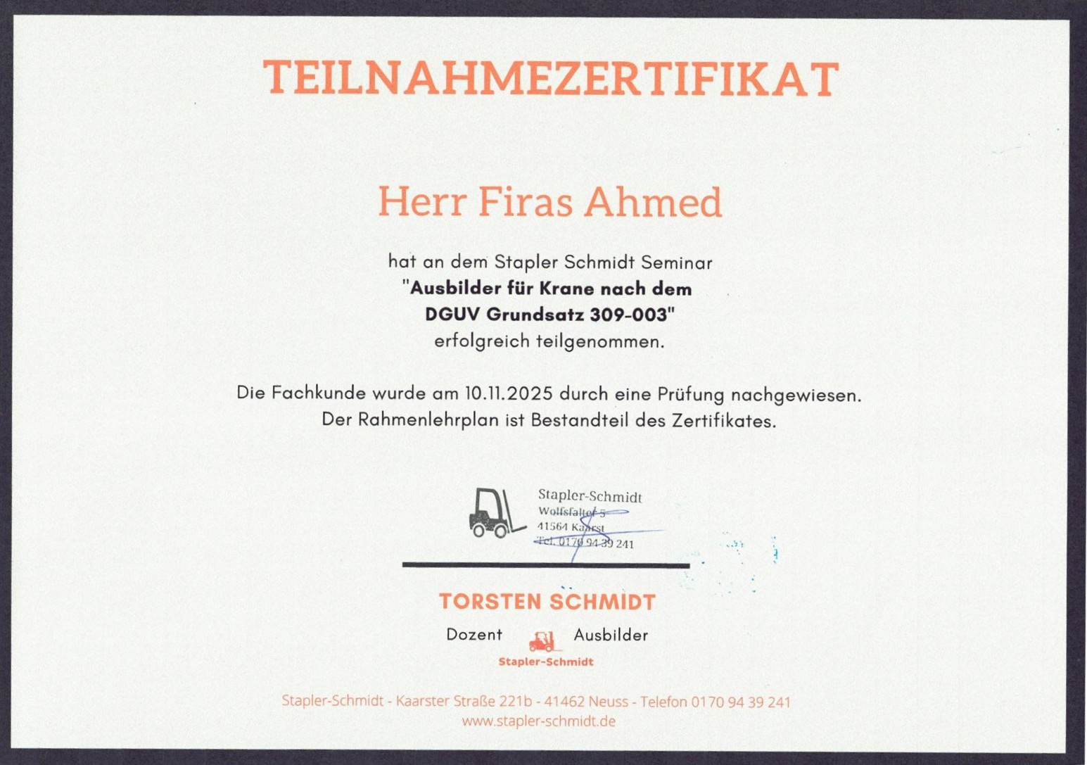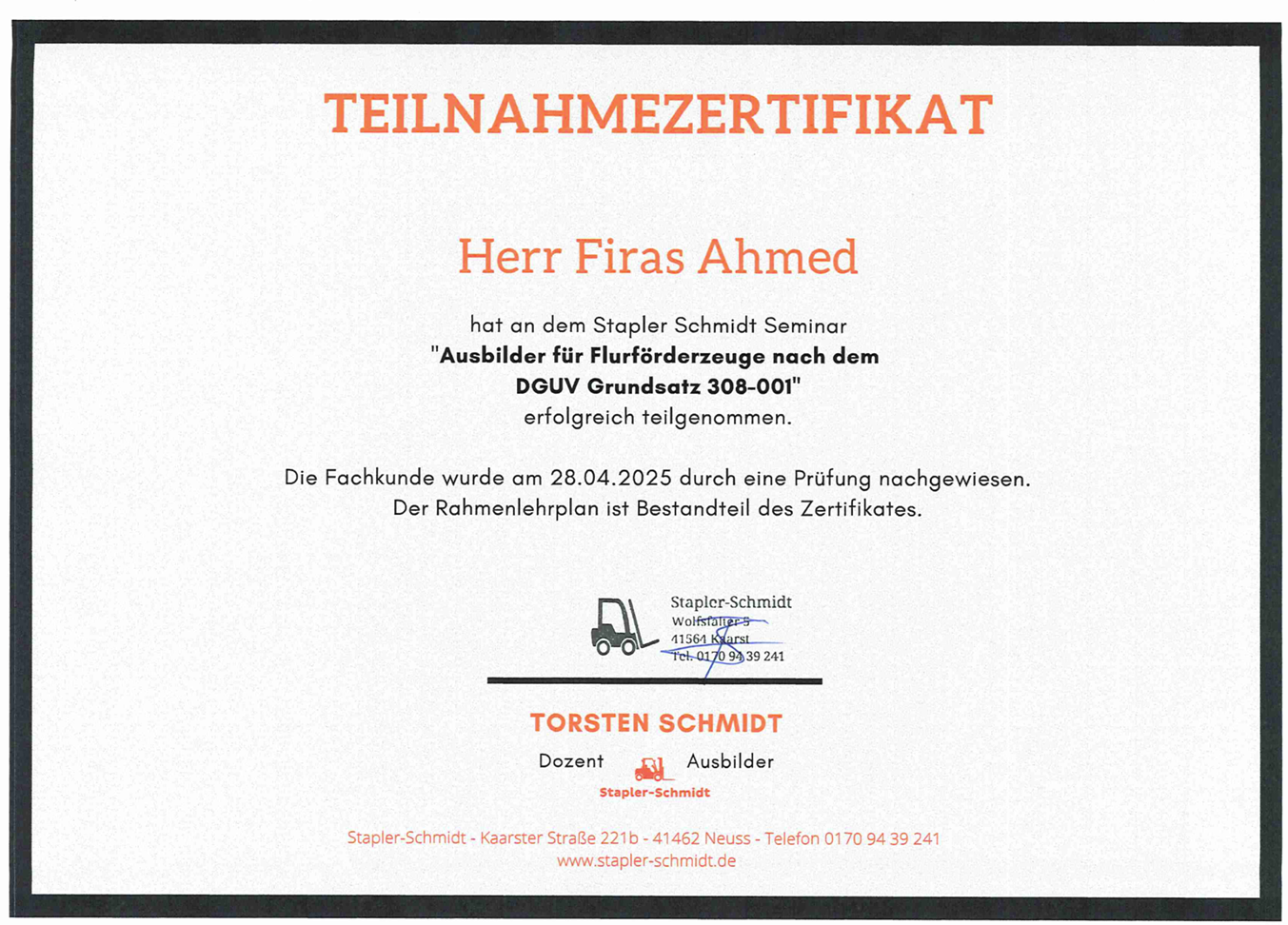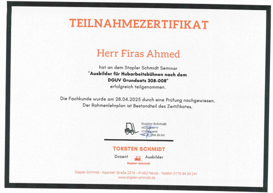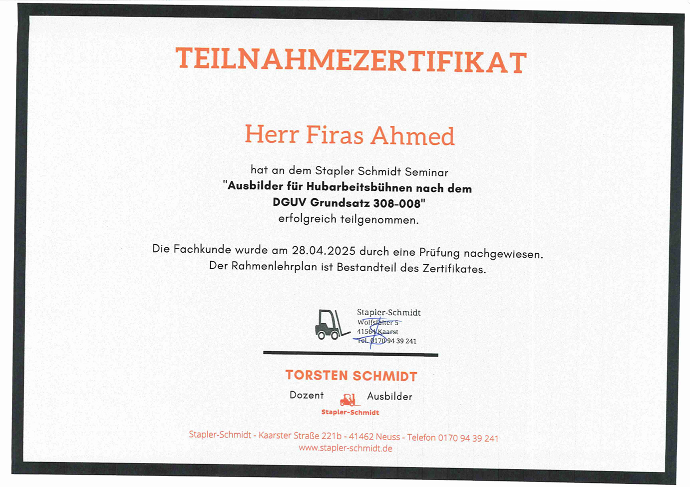 Mit fundierter Fachkompetenz, praxisnaher Erfahrung und kontinuierlicher Weiterbildung steht Firas Ahmed für Qualität und Zuverlässigkeit in seinem Fachgebiet. Auf dieser Seite erhalten Sie einen Überblick über seine Qualifikationen, Zertifikate und fachlichen Nachweise – als Ausdruck seines Engagements für professionelle Standards und sichere Arbeitsprozesse.